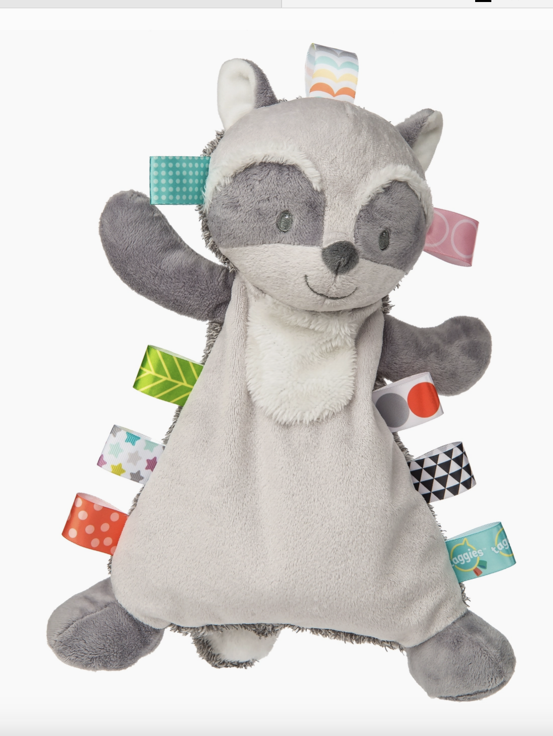 Harley Raccoon lovey is an soft friend in neutral greys with tags that add color that pops; Harley's sweet face features embroidered eyes and smile, and fluffy accents above his mask.