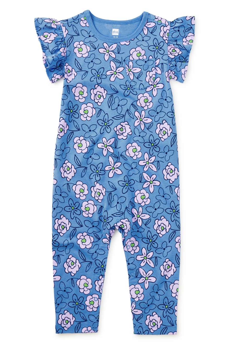 An easy, all-in-one favorite with sweet details throughout. This full-length romper features an artist-designed floral print and soft ruffle sleeves, finished with a front patch pocket for extra charm. Crafted from soft 100% cotton jersey, it's designed with snaps at the inseam for quick diaper changes and a comfortable fit that moves with baby from playtime to nap time. Made to be worn often, washed well, and loved long enough to be passed along. Perfect for matching moments with siblings.