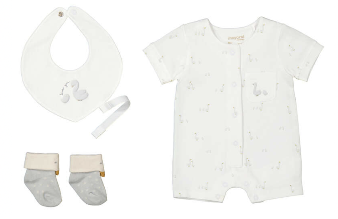Silver Goose Romper with Matching Socks and Bib