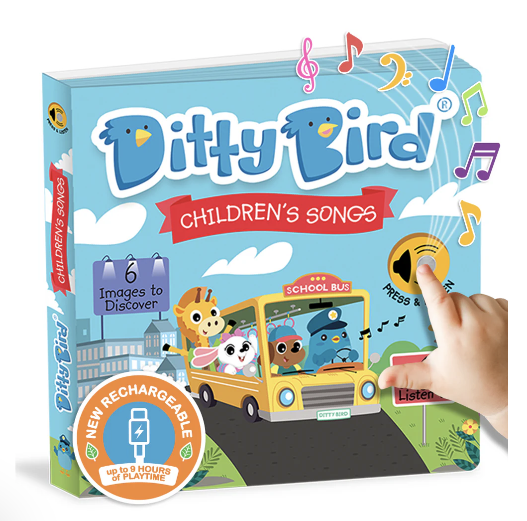 Join Ditty Bird on a delightful musical adventure! Press the sound dot to play six beloved children's songs, teaching your little one about animals, body parts, and the ABCs. Get ready for fun with classics like "The Wheels on the Bus" and "Head, Shoulders, Knees & Toes"!