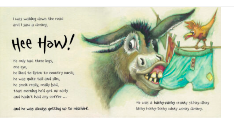 Children will be in fits of laughter with this perfect read-aloud tale of an endearing donkey. By the book's final page, readers end up with a spunky hanky-panky cranky stinky-dinky lanky honky-tonky winky wonky donkey!