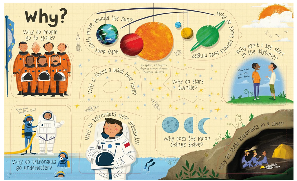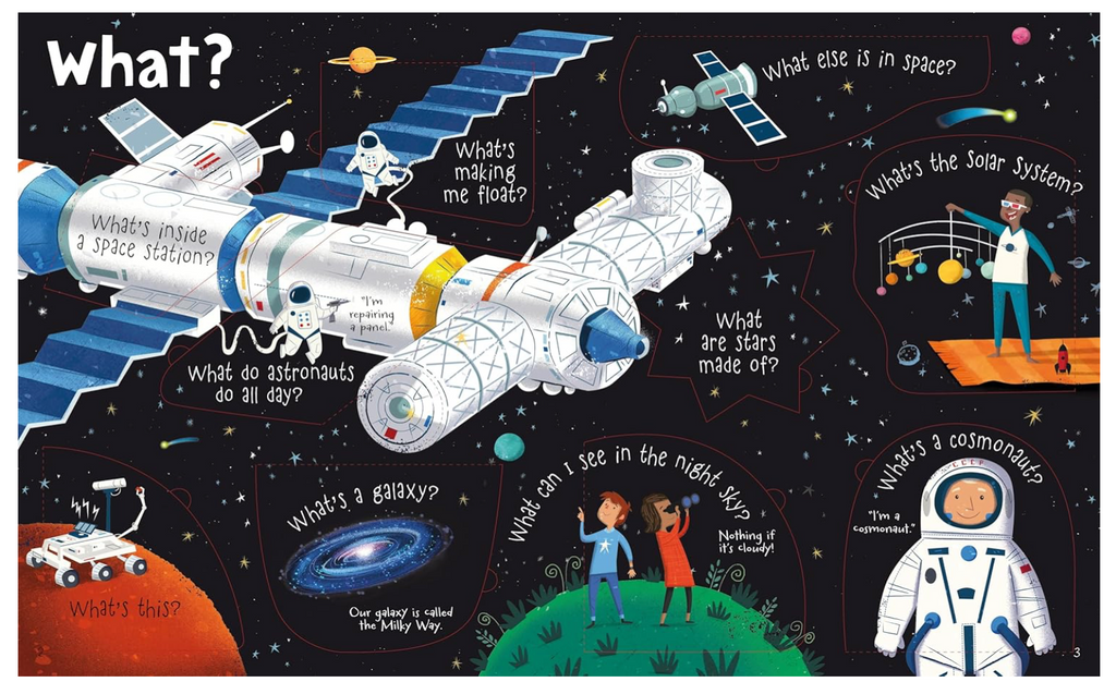 With over 60 flaps to lift, this delightful book answers questions such as "Where have people visited in space?", "What's a cosmonaut?", "Why can't I see stars in daytime?" and lots more what, where, how, why, and yes or no questions with answers beneath the flaps. Internet links take children to carefully selected websites to find out more.