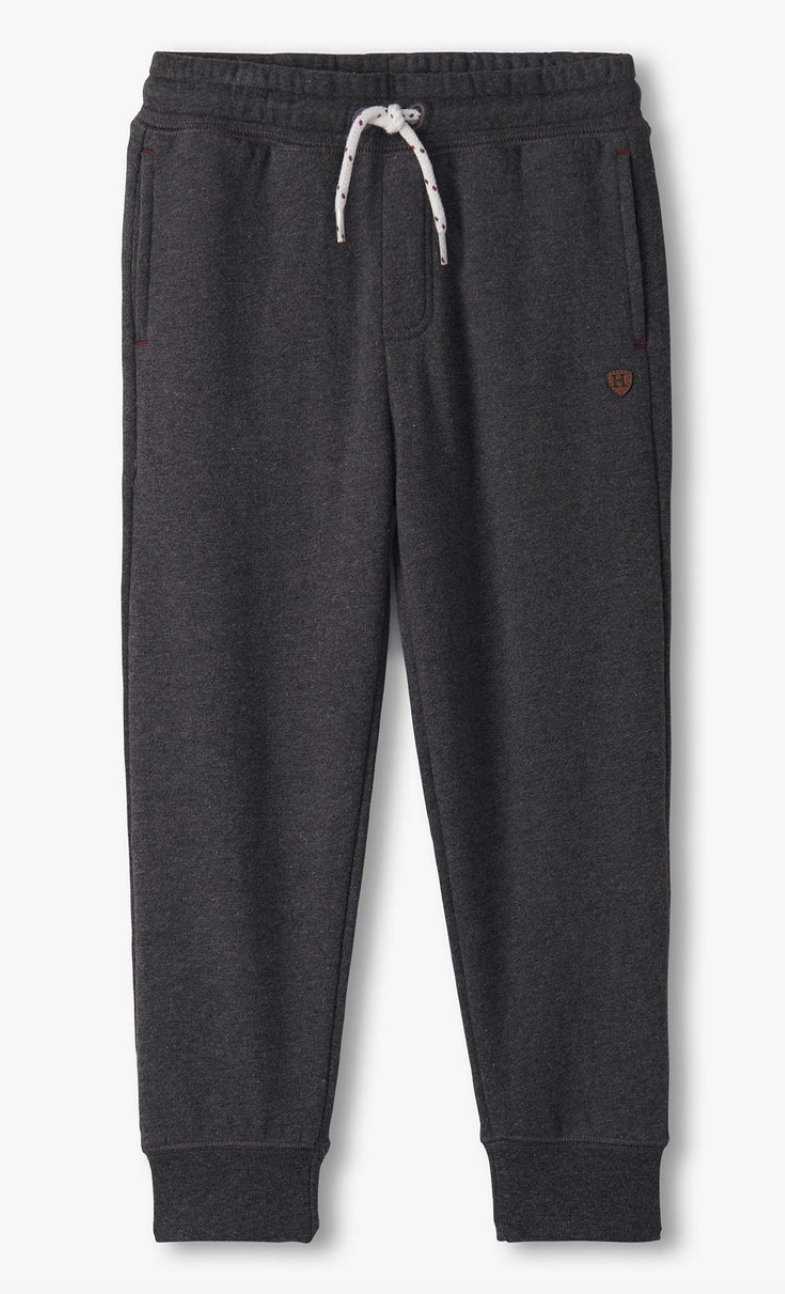 Keep him comfortable in the Boys Charcoal Melange Joggers, crafted from 100% cotton washed loop French terry for soft, breathable wear. These slim-fit joggers feature a deep charcoal grey hue and ribbed cuffs for a sporty, tapered look. The elastic waistband includes a functional white drawcord accented with small red details, adding a playful touch to the design. With two front slit pockets for everyday essentials, these joggers are perfect for both active days and lounging.