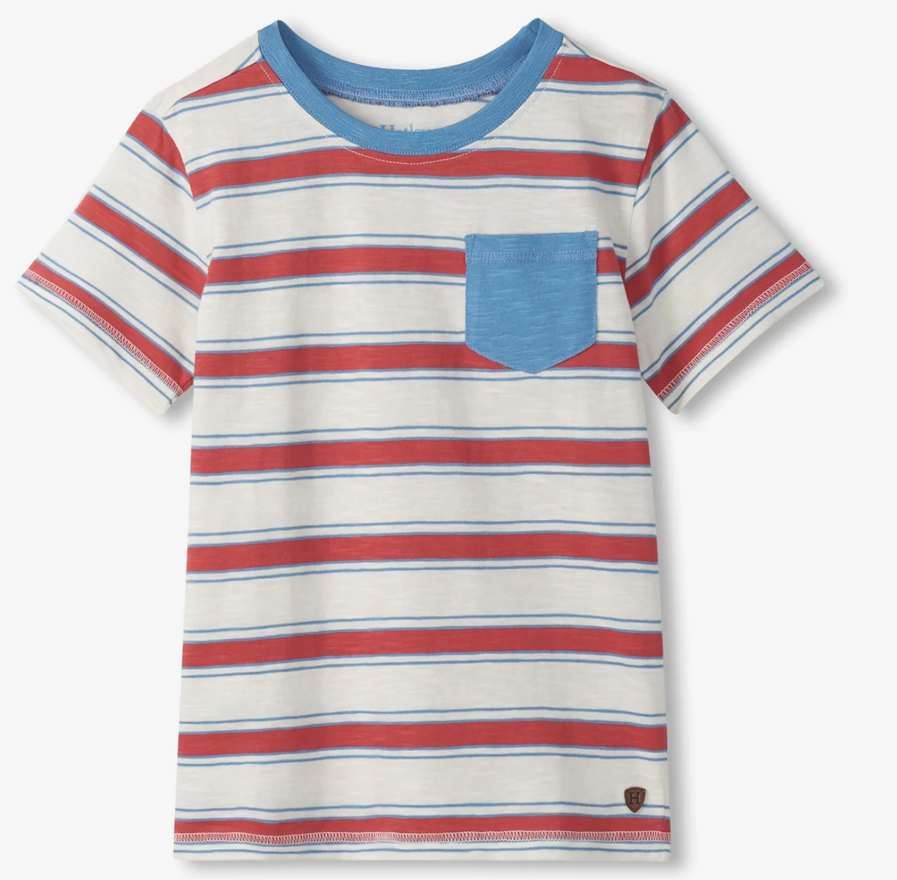 Coastal vibes meet classic style in this east coast stripes tee with a handy front patch pocket. The crisp stripe pattern brings preppy charm to his everyday wardrobe essentials. Soft cotton construction ensures all-day comfort whether he's at the beach or the playground. The functional pocket adds a practical touch for stashing small treasures found along the way. A versatile pick that works for casual outings, family gatherings, and everything in between.