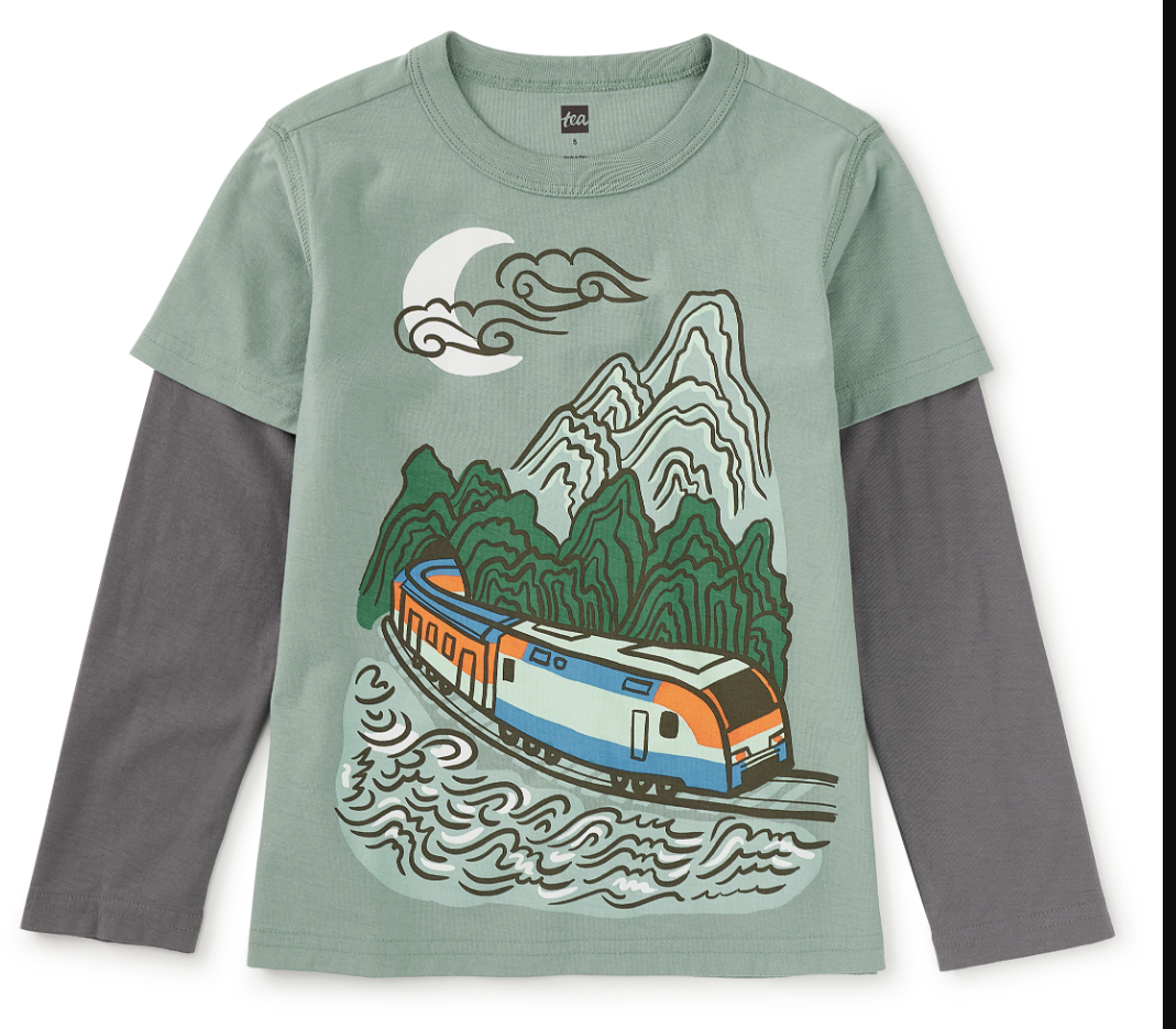 Inspired by the high-speed trains of South Korea, this tee captures the thrill of travel winding through mountains and rivers under the moonlight. The graphic is rendered in a painterly style, with smooth, expressive lines that give it striking texture and movement. Built-in layered sleeves add extra warmth and a cool, two-in-one look. Made of soft 100% cotton jersey. Style it with our fan-favorite Playwear Pants, our Cozy Lined Pants, or any of our joggers for an easy everyday look.