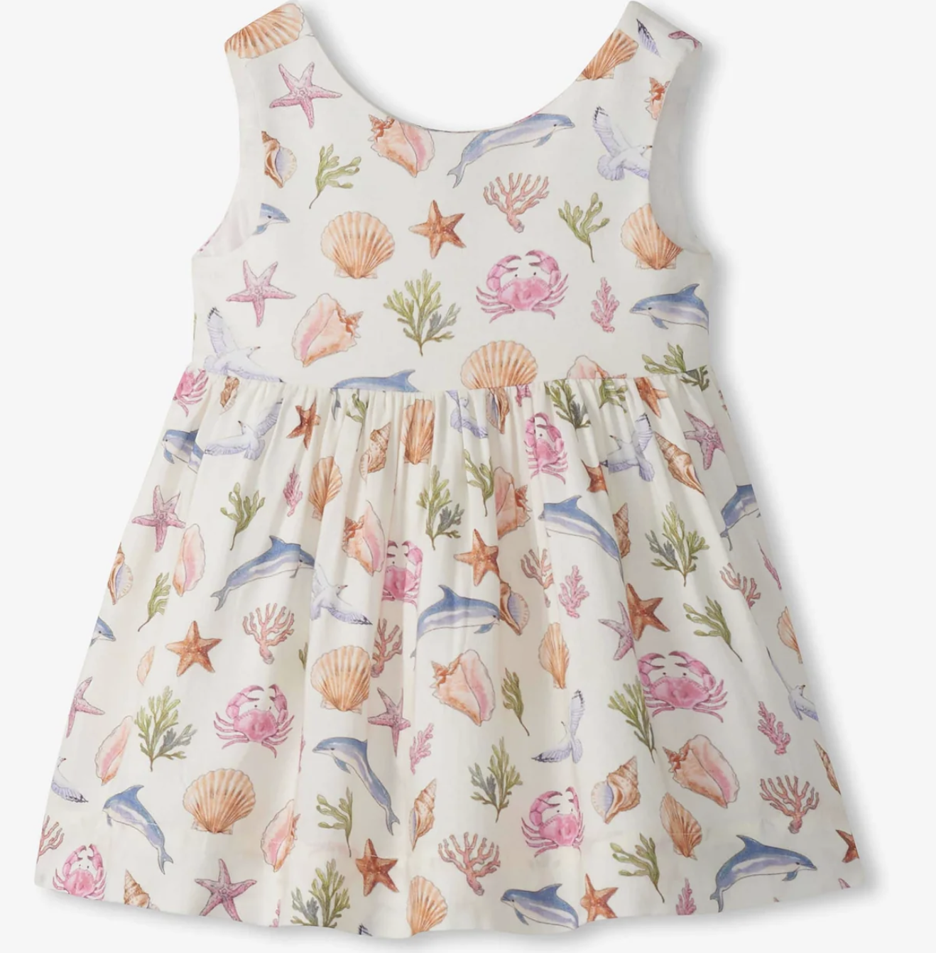 Charming vintage sea life creates a special-occasion worthy print on this elegant sleeveless dress. The flowing viscose fabric drapes beautifully while full lining provides comfortable coverage. A gathered waist creates a flattering fit while the polished neckline adds sophistication. Neat button-back closure makes dressing easy for special events. Perfect for seaside celebrations, beach weddings, and ocean-loving little party guests.