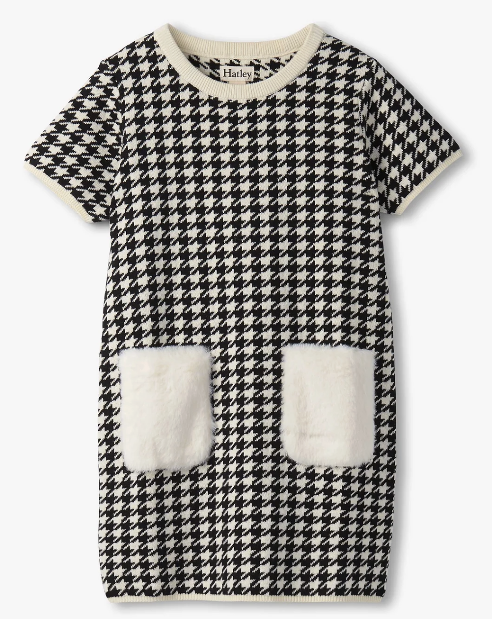 The Girls Houndstooth Sweater Dress with Faux Fur Pockets brings timeless style with a playful twist, crafted from 100% cotton yarn for cozy comfort. This short-sleeve sweater dress features a classic black-and-white houndstooth print in a straight, shift-like silhouette, accented by ribbed cream trim at the neckline, armholes, and hem. Two standout ivory faux fur patch pockets on the front add both texture and charm, making this piece as fun as it is fashionable.