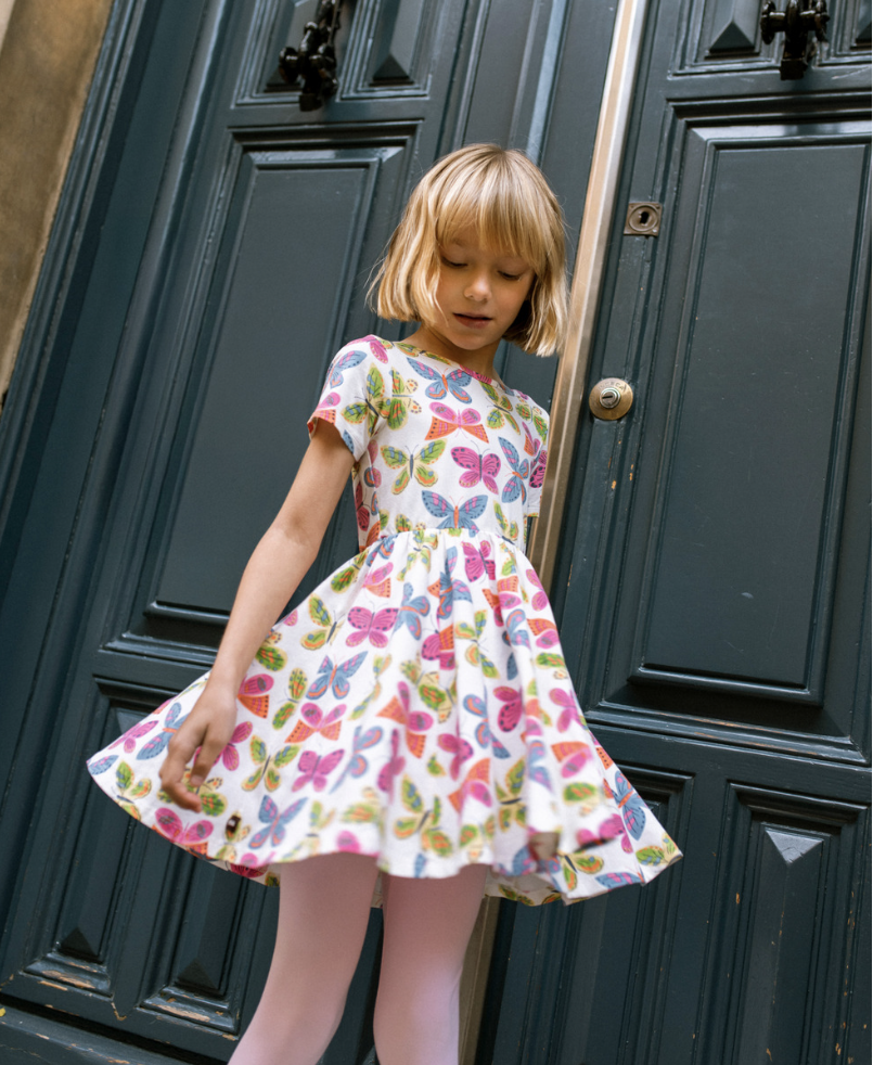 A longtime customer favorite, this ballet dress is made for movement, color, and easy charm. Expressive prints and a full circle skirt make it extra twirl-worthy, while the soft, stretchy jersey keeps kids comfortable through every spin and climb. Thoughtful details like the boat neckline and cross-back straps add a special touch without slowing them down. Pairs perfectly with leggings or Somersault Shorts for all-day versatility.