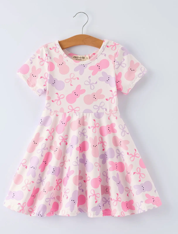 Spring Easter Bunny Bow Print Short Sleeve Dress
