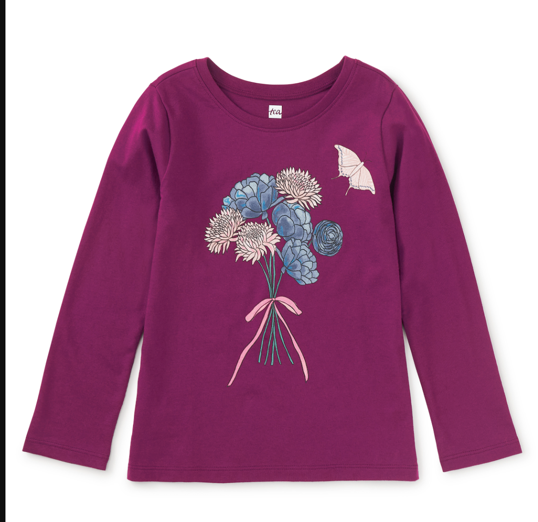 A fluttering butterfly meets a hand-drawn bouquet of chrysanthemums, a flower celebrated in Korean art for its elegance and resilience. Inspired by South Korean motifs, our in-house artists brought this delicate design to life. Crafted from 100% soft cotton, this tee pairs beautifully with our stretchy velour flare pants, twirly skirts, or a pair of comfy joggers for cozy winter outfitting.