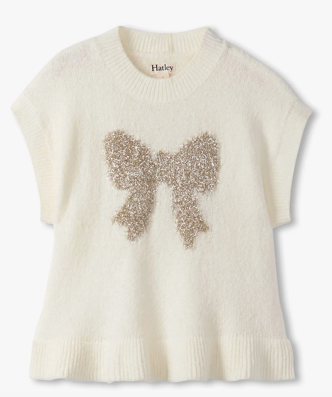 The Girls Gold Bow Everywhere Sweater Vest brings a mix of classic charm and playful sparkle, crafted from a soft cotton-acrylic blend yarn for cozy comfort. This cream-coloured sleeveless vest features dropped shoulders and a crew neckline with ribbed trim, paired with a wide ribbed hemline that adds structure and style. A full cardigan stitch flounce at the hem gives it a feminine touch, while the standout detail, a large metallic gold bow motif on the front, shimmers with sparkly threads for eye-catching appeal.