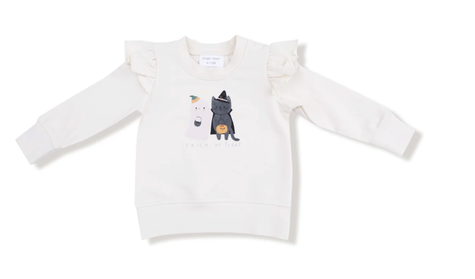 angGet your little boo ready for cozy chills and sweet thrills! Our Ruffle Sweatshirt is made from snuggly French Terry and features playful shoulder ruffles plus an adorable silk screen print of a friendly ghost and cute cat with the words “Trick or Treat.” Perfect for pumpkin patches, costume parties, or just spreading spooky-season smiles!