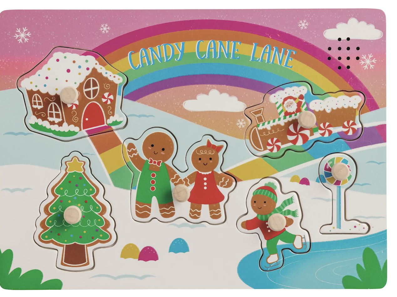 Wooden puzzle plays coordinating sounds when wooden pieces are put in place. Requires 2 AA batteries, not included. Ages 3+.