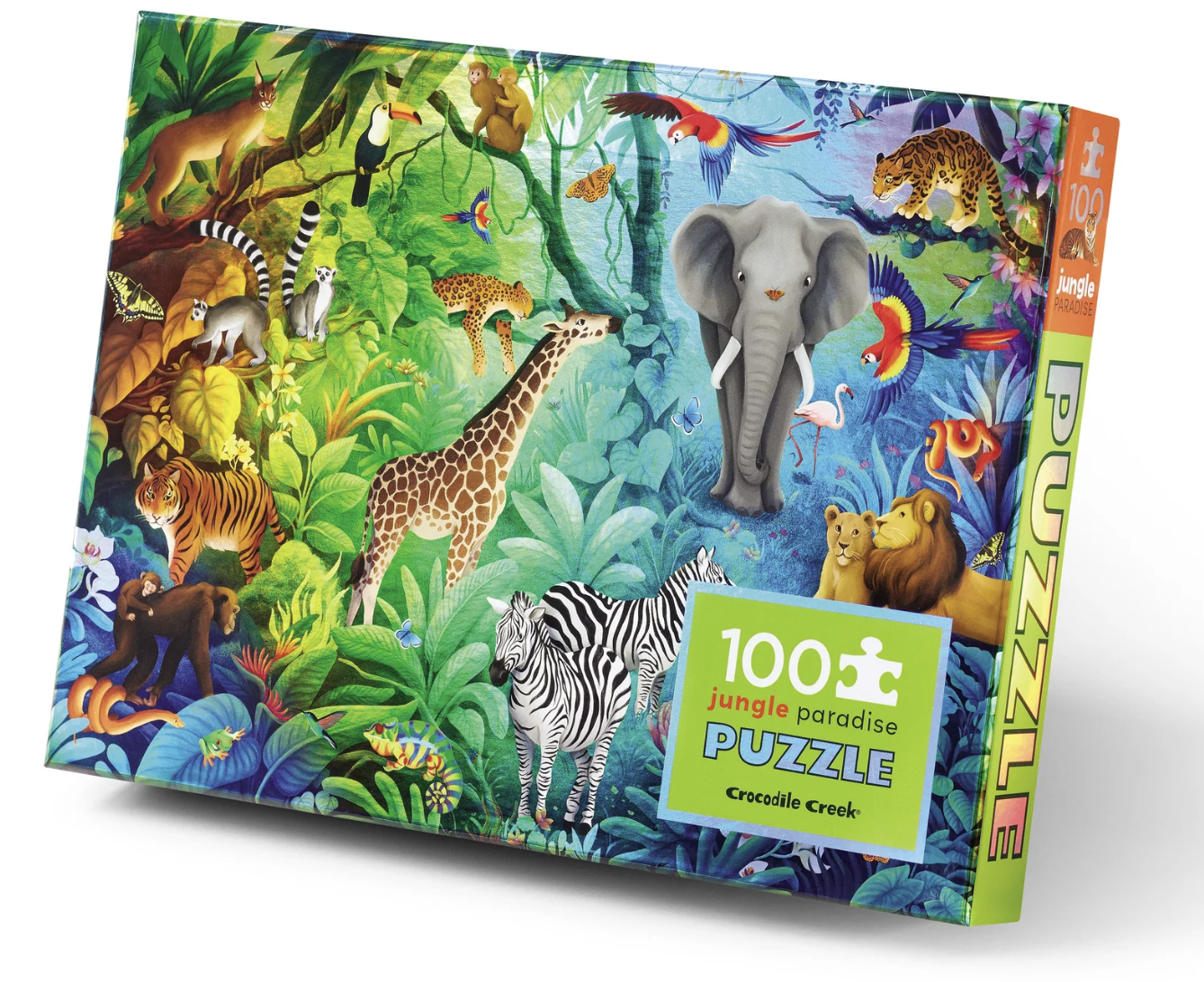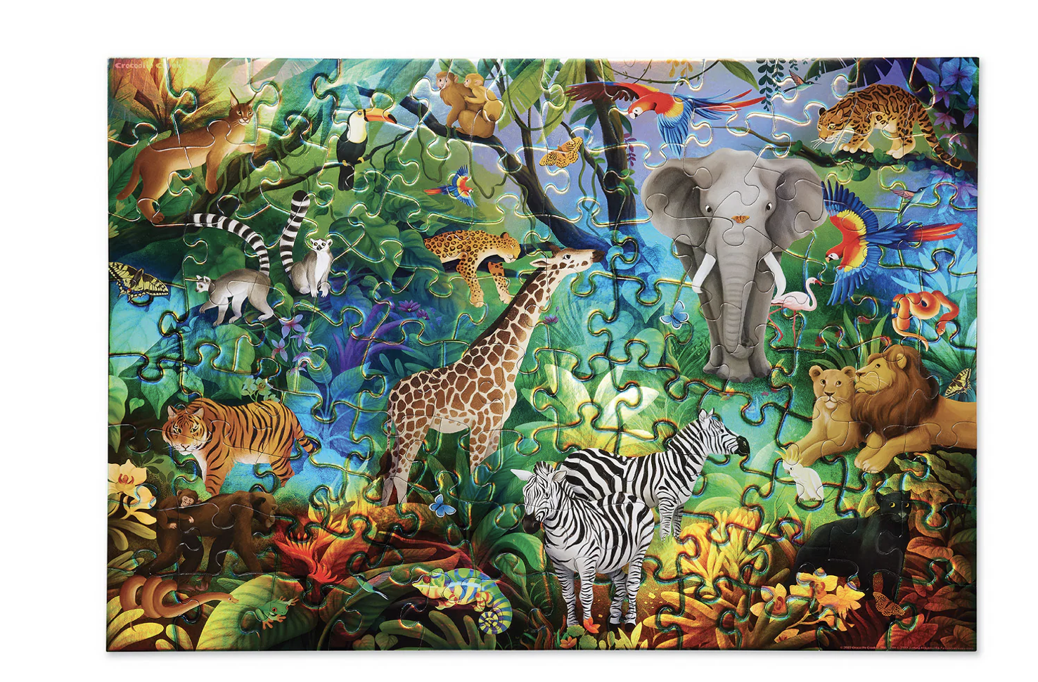 Discover a magical Jungle World with this 100-piece holographic puzzle! Bring the adventure to life with dazzling foil accents and vibrant, detailed illustrations while developing puzzle-solving skills and hand-eye coordination. Crafted with high-quality blue board and soy-based inks, this puzzle will amaze and delight for years to come.