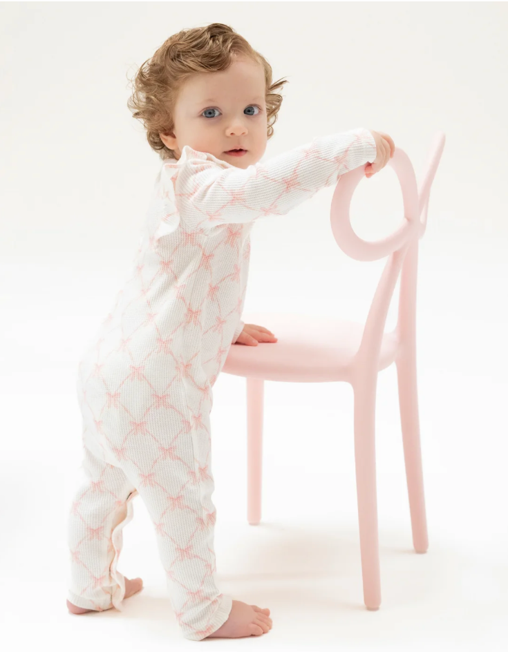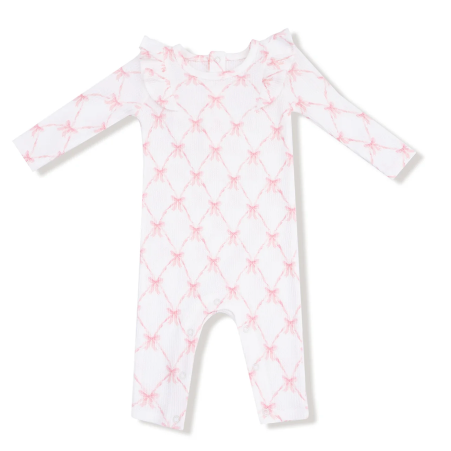 Ribbon Bow Trellis Ruffle Romper Pink and White