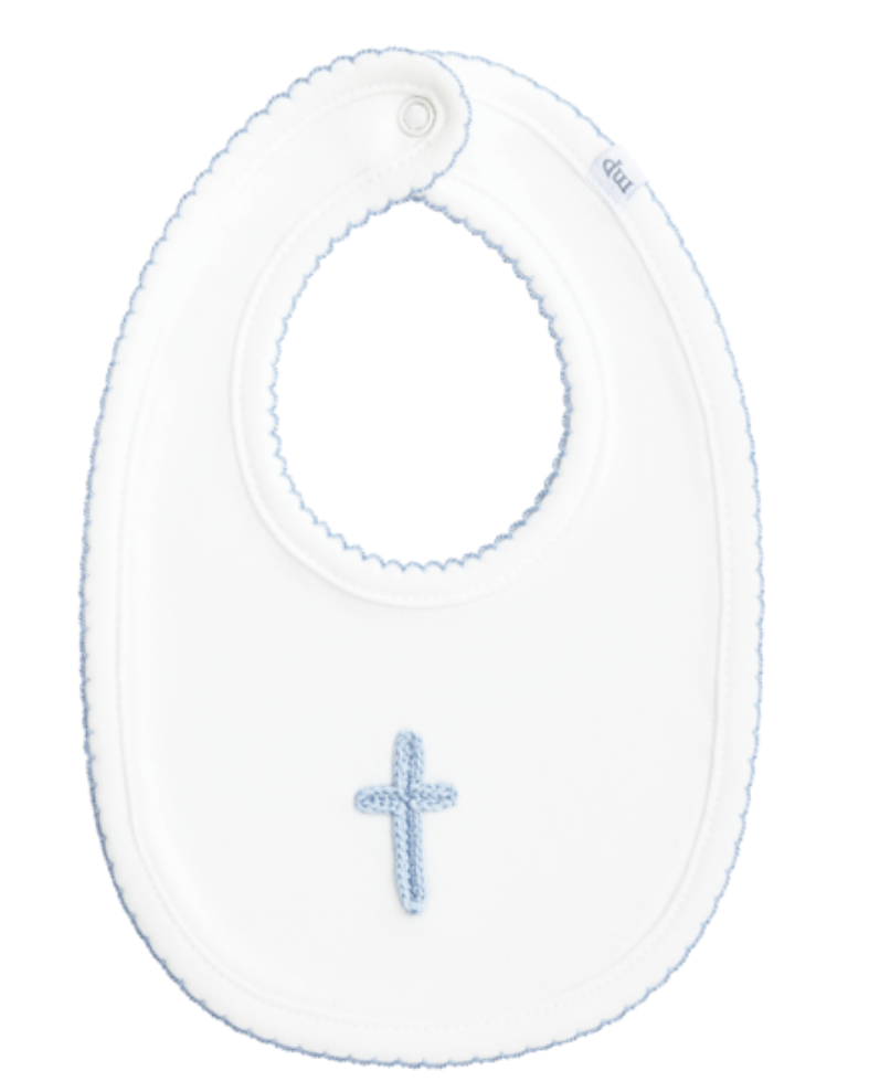 This charming Pink and Blue Crochet Cross Bib is a delightful addition to any baby's mealtime essentials. Crafted from soft, breathable 100% cotton interlock fabric, it ensures comfort and durability for your little one. The bib features an elegant crochet cross icon, adding a touch of sophistication and style. The delicate picot stitch detail enhances its overall appeal, making it a perfect choice for special occasions or everyday use. Measuring 9" x 6 1/4", it provides ample coverage to protect your baby's clothing from spills and messes. Easy to clean and gentle on sensitive skin, this bib combines practicality with a timeless design, making it an ideal gift for baptisms, christenings, or baby showers.